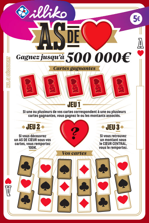 Après BlackJack, la Française des Jeux lance, en juin 2022, un nouveau ticket à gratter sur le thème des jeux de carte avec As de coeur. Vendu au prix de 5 euros, ce jeu de grattage est proche du fonctionnement de Cash, mais en remplaçant les numéros par des cartes et en ajoutant des petits jeux supplémentaires pour pimenter l’expérience. Si vous aimez les jeux de cartes en général, alors laissez vous tenter par As de coeur, et si la chance vous sourit, vous pouvez remporter jusqu’à 1 demi million d’euros !